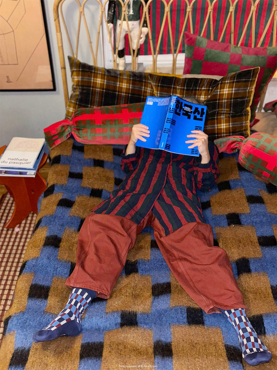The Evelina Kroon Blue Pattern brings together my go-to colors, blue, burgundy, and off-white; a combo that probably reflects my style the most. But in the end, it’s all about the bigger picture; they shine brightest as a team.
