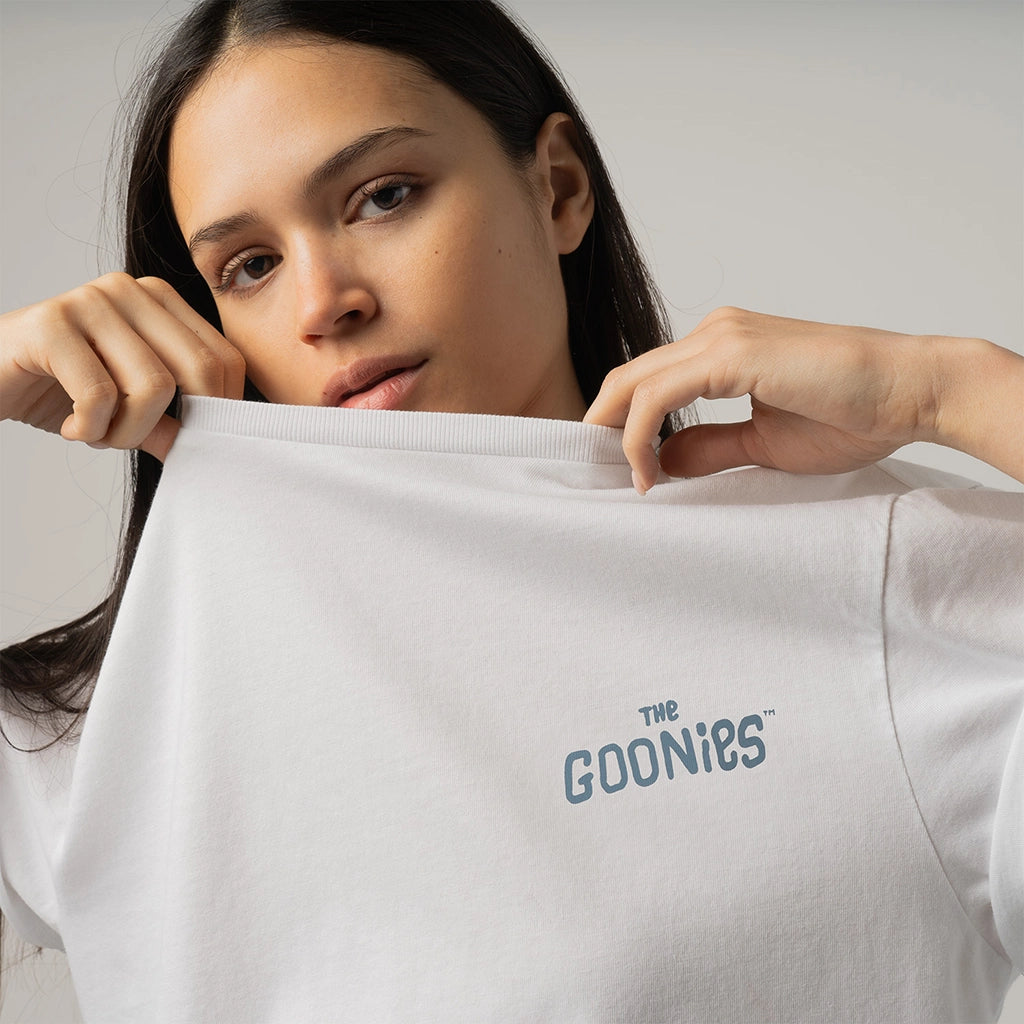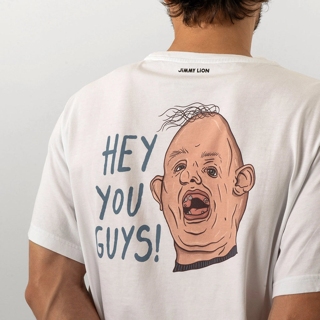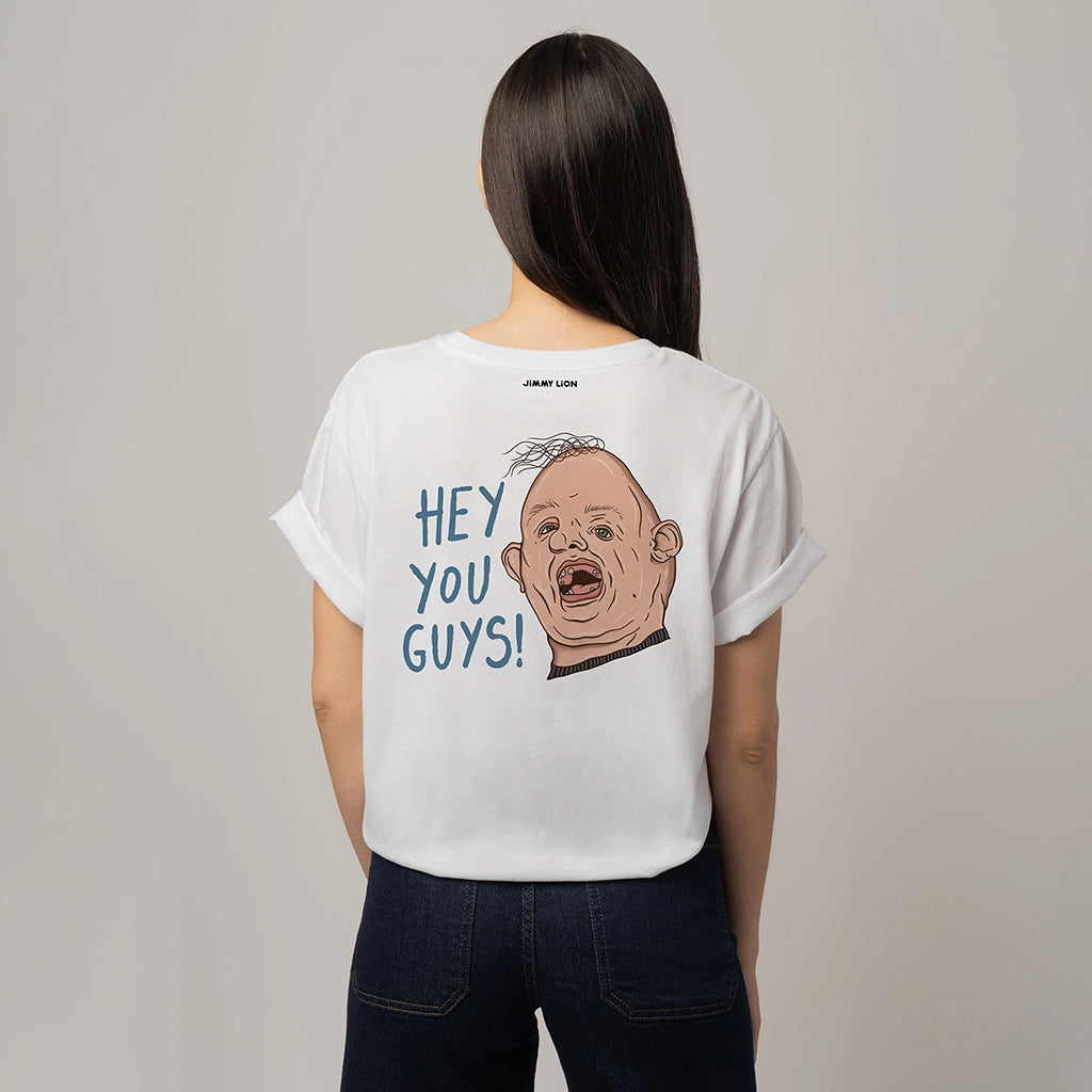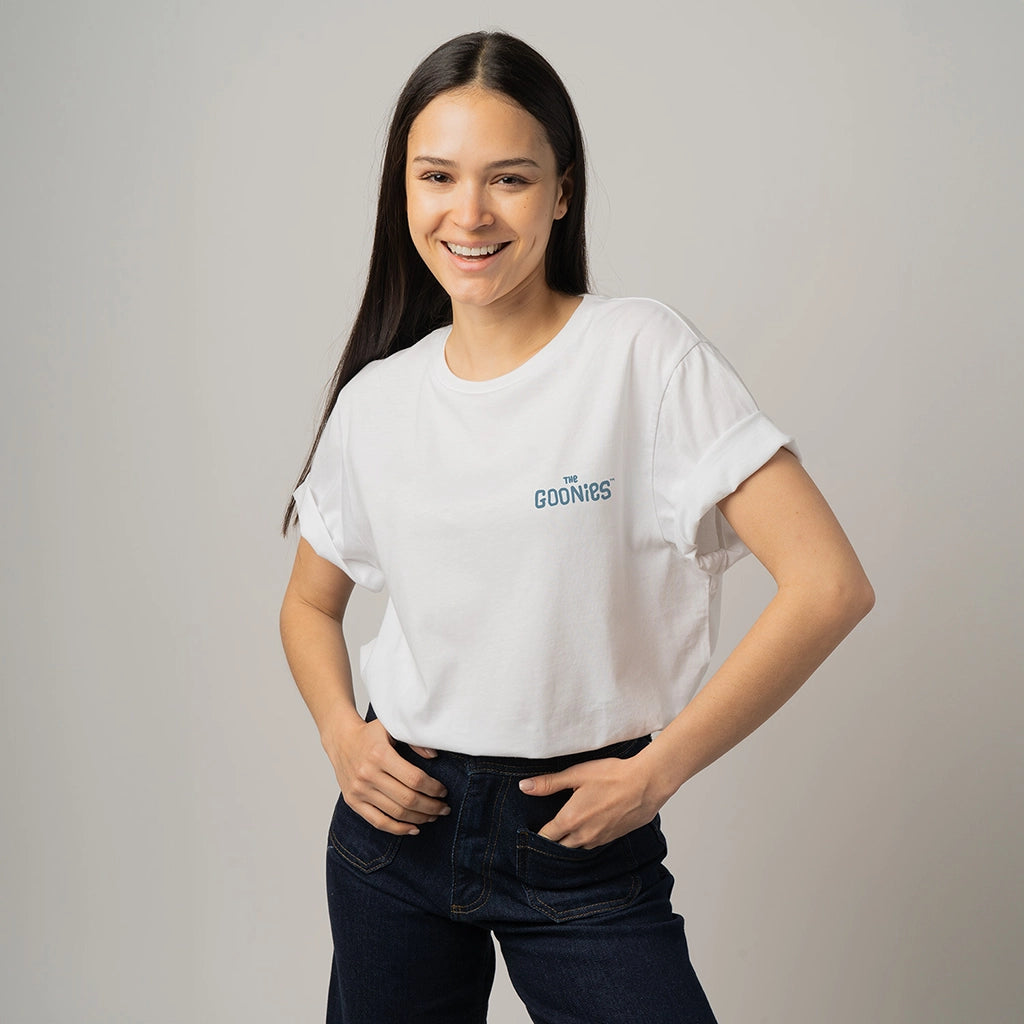 Te presentamos la camiseta más original: la camiseta de Sloth de The Goonies™. Esta camiseta blanca impecable lleva el título de la peli en el pecho y, en la espalda, la inolvidable cara de Sloth gritando: ''HEY YOU GUYS!" ("¡EH, CHICOS!").