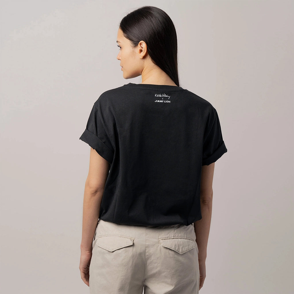 Step into the playful world of Keith Haring with our white tee showcasing his legendary Andy Mouse character. With the head printed on the chest and a larger design on the back, this shirt embodies Haring's whimsical spirit. It's a fun way to celebrate creativity and keep your style fresh.